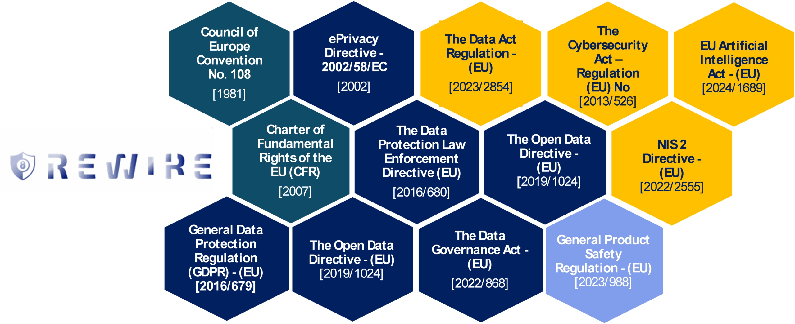 The REWIRE project and its partners aim to ensure the adherence of all relevant EU-level legal frameworks and directives toward privacy and personal data protection, maintenance of high cybersecurity standards, and guarantees of the ethical use of the data within the EU. The present blog article summarizes the key legislative frameworks that guide the REWIRE consortium’s practices throughout the project’s lifecycle. More specifically, Figure 1 below showcases the EU Legislations, directives and other regulatory and legal instruments consulted within the context of REWIRE project.
